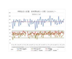 次に,起床後20分以上経過した後,朝一番ではかる血圧である早朝血圧についても,排塩サプリ服用開始前後2ヶ月間の変遷をみてみる。早朝血圧は,気温と体内に貯留している水分量(体重)の影響がはっきり出ると思う。