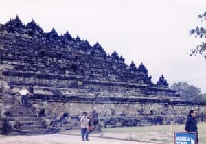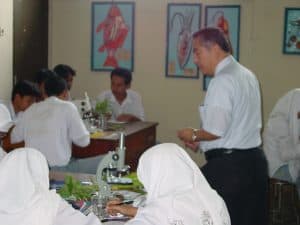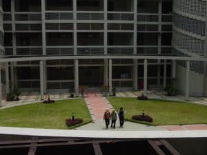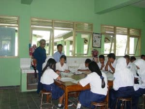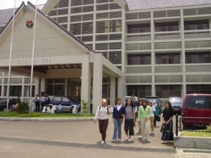 インドネシア教育大学理数教育学部棟玄関付近(車の傍にいるのが日本人関係者)