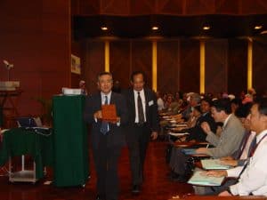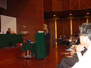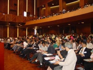 National Seminarで講演を待つ筆者(前列手前から3人目,紺色の上着),インドネシア教育大学内の講堂にて